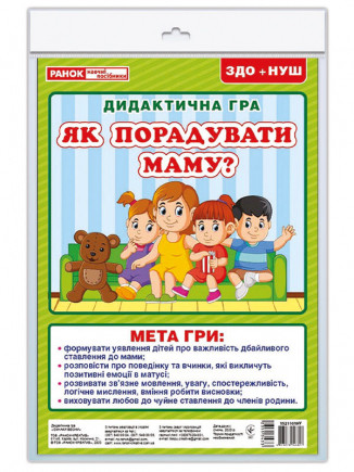 Радувати маму теж треба вміти! Дидактична гра навчить не тільки дбайливо ставитися до матусі, а й дасть цінні поради, як викликати у найдорожчої людини позитивні емоції. Використовуйте гру під час тематичних тижнів про родину, на виховних годинах або вдома для самостійних занять. У складі: велике глянцеве ігрове поле (формат 21х30 см), 24 картки та рекомендації до гри.